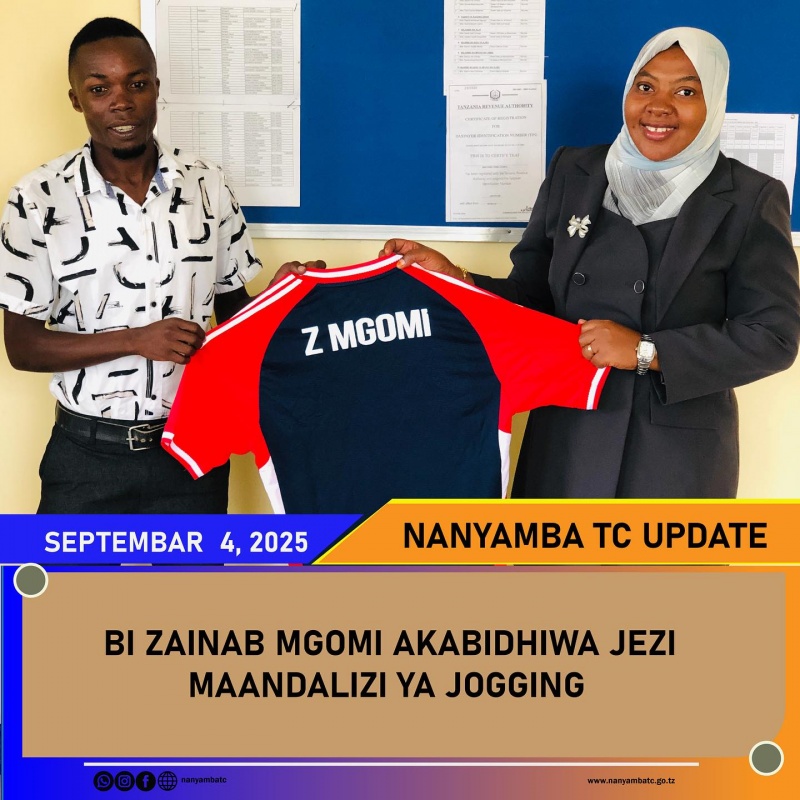 Mkurugenzi wa Halmashauri ya Mji Nanyamba, Bi Zainabu Mgomi, amekabidhiwa jezi leo ofisini kwake na Afisa Michezo Yahaya Athumani Kibaraka, ikiwa ni sehemu ya maandalizi ya kushiriki katika jogging.