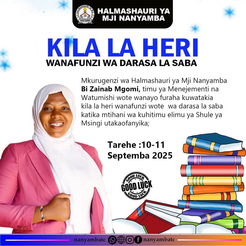 Mkurugenzi wa Halmshauri ya Mji Nanyamba, timu ya menejimenti na watumishi wote wanayo furaha kuwatakia mtihani mwema darasa la saba.