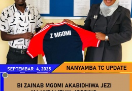 Mkurugenzi wa Halmashauri ya Mji Nanyamba, Bi Zainabu Mgomi, amekabidhiwa jezi leo ofisini kwake na Afisa Michezo Yahaya Athumani Kibaraka, ikiwa ni sehemu ya maandalizi ya kushiriki katika jogging.
